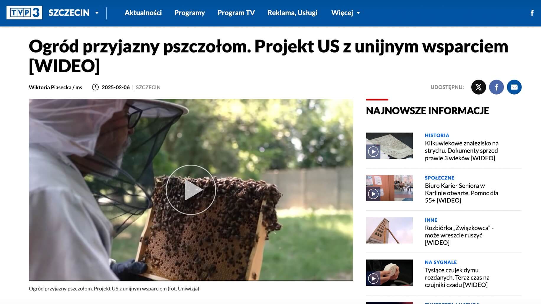 Dnia 06 lutego 2025 w TVP3 Szczecin został wyemitowany materiał dotyczący projektu „Pszczeli Raj – ogród przyjazny zapylaczom”, realizowanego przez Centrum Immunologii Doświadczalnej oraz Immunobiologii Chorób Zakaźnych i Nowotworowych Uniwersytetu Szczecińskiego przy wsparciu środków unijnych. W reportażu przedstawiono m.in. działalność Pasieki IMMUNO, która odgrywa istotną rolę w ochronie bioróżnorodności oraz prowadzeniu badań nad odpornością pszczół i ich wpływem na środowisko.